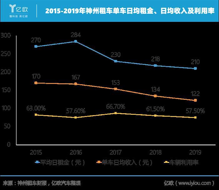 神州租车平均日租金从2016年最高的284元降至2019年的210元,跌幅达26%;单车日均收入从2015年最高的170元降到2019年的122元,跌幅达28%以上;2017年后,其车辆利用率也在逐渐下降。