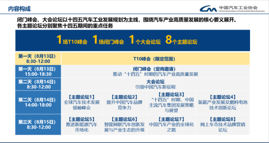 与前9届相比,本届论坛继续保留了3大独有特色会议,并在中汽协研究的汽车产业“十四五”规划框架下,充分征集社会和汽车产业各界普遍关心的重要问题,对论坛独有的3大环节进行提炼聚焦、重新设计和全面升级,同时,其他6个主题论坛各负使命,内容既聚焦又丰满。