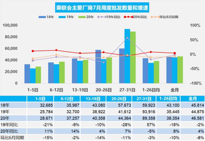 由于部分厂家本周休高温假,数据汇总较慢,增幅很难做准确判断,目前预估7月1-31日的主要厂商批发销量日均4.7万辆,同比去年7月增长4%。但相对6月总体下降8%。