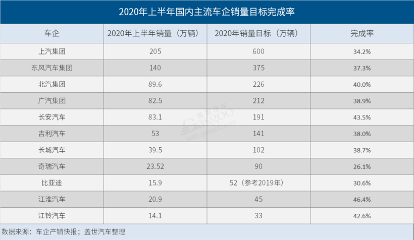 2020上半年,各大车企因疫情影响均出现不同程度损伤,车界地球仪通过对已公开数据进行梳理发现,上半年销量目标完成率超过五成的企业几乎没有,绝大多数车企半年完成率在30%-40%之间。然而,截至目前为止,仅有长城、长安、广汽等少数车企调低了销量目标。