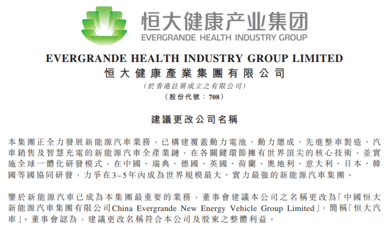 7月27日,恒大健康发布公告称,鉴于新能源汽车已成为集团最重要的业务,董事会建议公司名称由“恒大健康产业集团有限公司”改为“中国恒大新能源汽车集团有限公司”,简称“恒大汽车”。