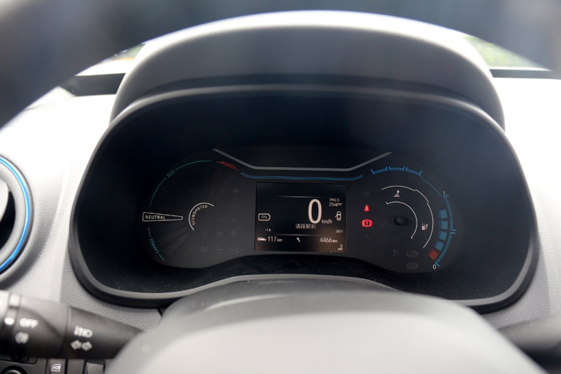 单看动力参数不够起眼,但带动不到一吨的车来说还是很够的。在城市路面行驶,并线、超车都比较轻松,提速时动力响应很快。遇到上坡路面,也是一脚油门就能从40km/h到70km/h轻松上坡。驾驶模式有标准和经济两种。标准模式下,动力随踩随有。经济模式下,方向盘比标准模式稍重些,踩下同样深度的油门踏板需要更用力。同时,经济模式下由于能量回收更强,松开加速踏板后能够感受到比标准模式更明显的拖拽感。
