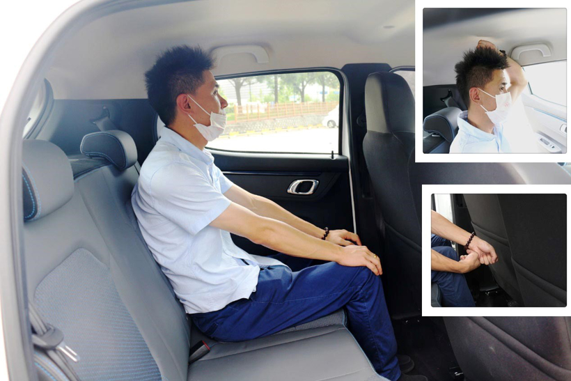 坐在驾驶位,头部空间距离车顶约有两拳的距离。保持前排座椅不动,后排头部空间约有一拳的距离,腿部空间有两拳的距离。