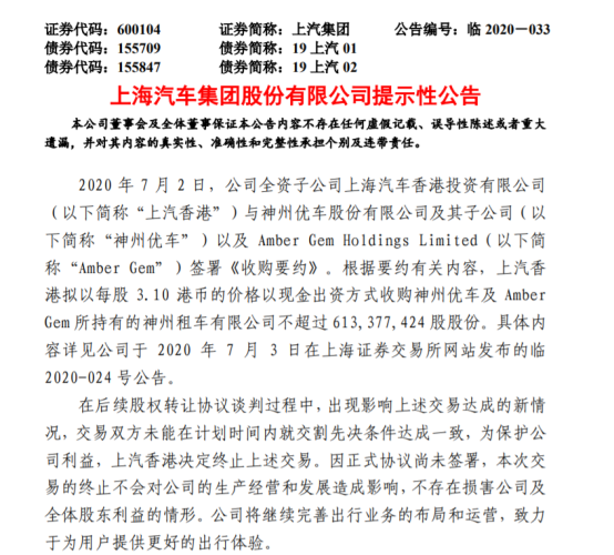 7月20日,上汽集团发布公告称,公司全资子公司上汽香港与神州优车及其子公司在后续股权转让谈判过程中,出现影响交易达成的新情况,交易双方未能在计划时间内就交割先决条件达成一致,为保护公司利益,上汽香港决定终止该项交易。据悉,本月初,上汽集团宣布上汽香港与神州优车及其子公司,以及Amber Gem Holdings Limited签署《收购要约》,上汽香港拟以每股3.10港币的价格以现金出资方式收购神州优车及Amber Gem所持有的神州租车有限公司不超过6.13亿股股份。