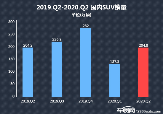 从近一年来各季度销量变化来看,二季度SUV(除进口车)销量走出低谷,重新回归200万辆的常态,较一季度上涨48.9%,与去年同期相比基本持平。