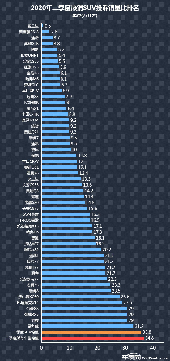 作为国内领先的缺陷汽车产品信息和车主质量投诉信息收集平台,车质网采用“投诉销量比”评价体系,对2020年二季度国内SUV产品进行分析。除进口车型外,二季度有销量数据支撑的SUV共有277款,其销量之和为204.8万辆。为确保数据的准确性,车质网本次只统计这277款车型的首次投诉案例,最终计算得出二季度国内SUV投诉销量比均值为万分之33.8。